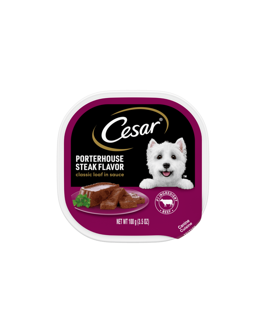 Dogs love the great taste of CESAR Wet Dog Food. Crafted without grains and with Beef as the #1 ingredient, CESAR Porterhouse Steak Flavor Classic Loaf in Sauce is guaranteed to tempt even the fussiest eater. CESAR Canine Cuisine provides the complete and balanced nutrition your dog needs, with the taste and variety they can't resist. The CESAR brand always makes mealtime easy with convenient trays and no-fuss, peel-away freshness seals. Our gourmet wet dog food uses ingredients formulated to meet nutritional levels established by the AAFCO dog food nutrient profiles for maintenance. Spoil the dog you love with CESAR Wet Dog Food.