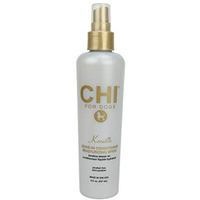 Style:Leave In Conditioner Spray CHI For Dogs provides luxurious and pH balanced formulas designed for optimal care for your dog's coat and skin. Developed with the same superior technologies as in our professional salon CHI human lines, the formulations are gentle yet effective. They provide moisturizing and balancing ingredients that penetrate the coat's cuticle, strengthening the follicles of the fur as they nourish it from the inside out. CHI For Dogs imparts a superior shine and provides the necessary moisture for a softer, healthier looking dog.CHI For Dogs Keratin Leave-In Conditioner Moisturizing Spray is a unique reconstructing treatment designed to rebuild hair's cuticle.