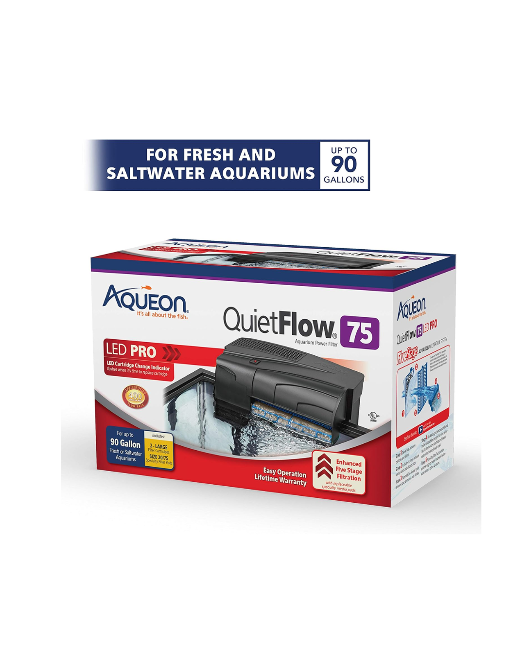 LED filter cartridge change indicator light that flashes when the cartridge becomes clogged with debris, providing a reminder that it's time to replace the cartridge. A great benefit of the Aqueon QuietFlow filters is the internal pump design that helps dampen noise, eliminates leaks and because it is self-priming, starts up automatically after cleaning or power interruptions. Higher flow rates also ensure a higher dissolved oxygen content for healthier, more active fish.