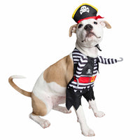 Perfect for the next time they set sail for an adventure to the backyard to search for buried treasure, your dog will look their best for Halloween with this dog pirate costume! This costume set comes with two pieces: a pirate hat (with skull and crossbones obviously) and a black and white striped pirate bodysuit. The bodysuit is designed to look like a complete outfit with a vest, pants and a belt. It attaches behind the pet's neck with an adjustable hook and loop closure. The hat has an adjustable elastic strap to comfortably secure to your dog's head. This costume is available in sizes Small, Medium, Large and Extra Large to fit a wide range of pets.