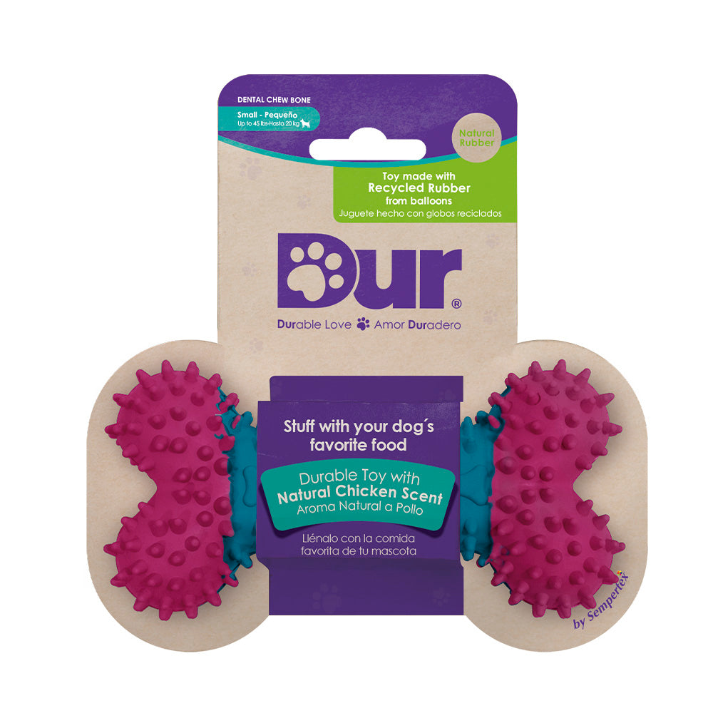 The DUR Brand Dog Bone Toy is perfect for pets! It is made with super durable material and is specially designed to withstand the strongest of chewers. Plus, with its chicken aroma, your dog won't be able to resist. Keep your best friend entertained!