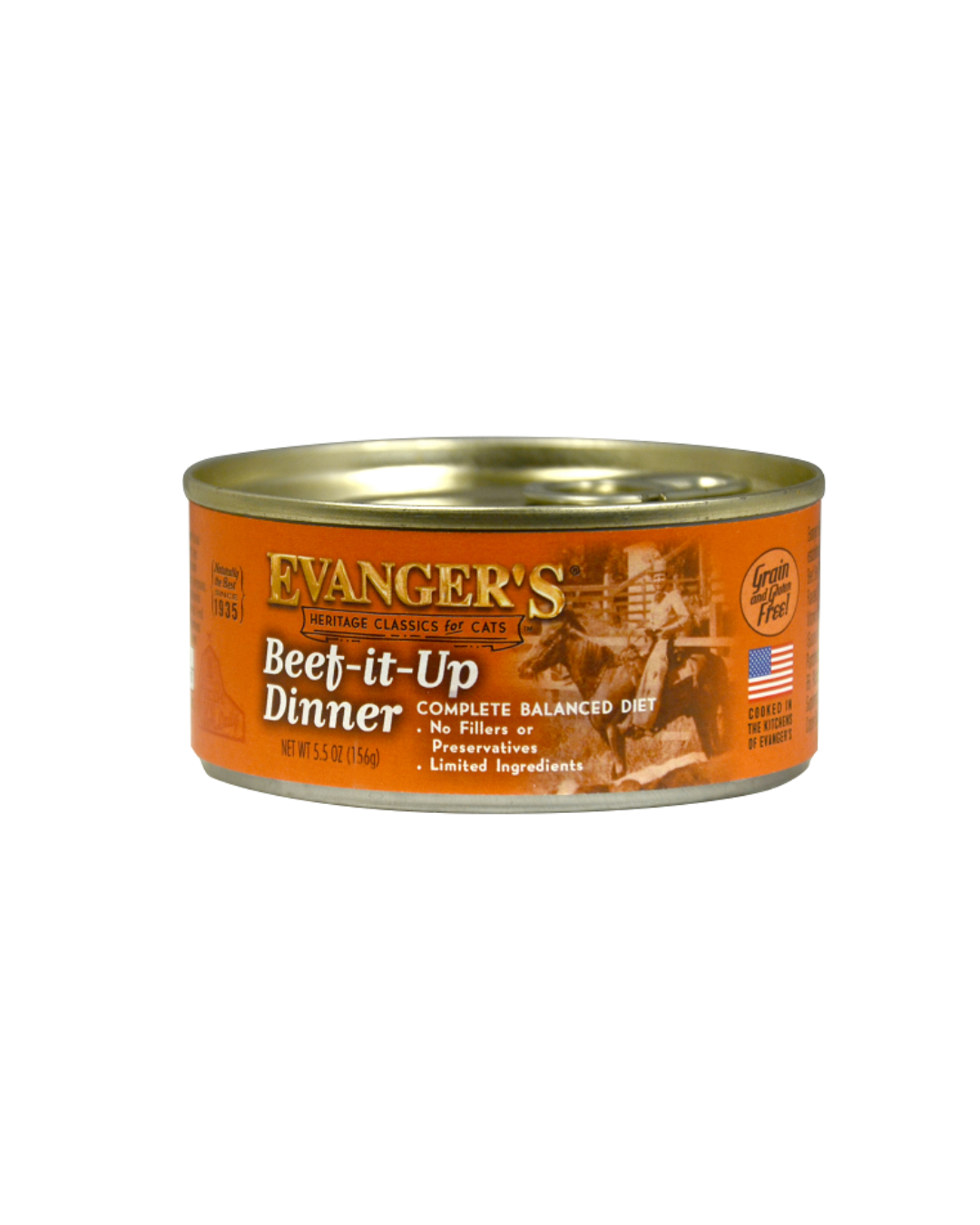 Evanger's Beef It Up Dinner is formulated to meet the nutritional levels established by the AAFCO nutrient profiles for all life stages. Kittens, pregnant and nursing cats may require 2-3 times above amounts, and reduced for less active or older cats. Amount of food your cat requires depends on activity, age, environment and breed.